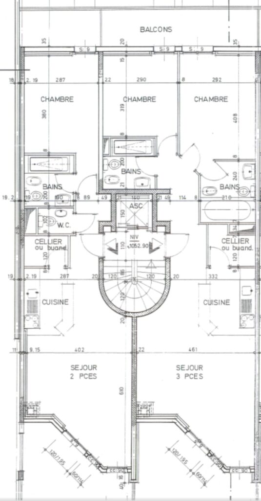 Les appartements de trois chambres offrent des espaces de vie remarquablement grands et conservent souvent leurs deux portes d’entrée. Bien que les configurations varient, le plan d’origine prévoyait une salle de bains par chambre. Les chambres font en moyenne 12 m².