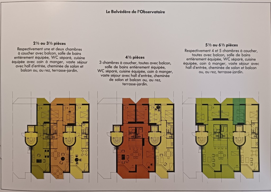 Les promoteurs ont décidé de standardiser l’ensemble en unités de 2,5 pièces (1 chambre) et 3,5 pièces (2 chambres), puis de fusionner deux unités pour créer des appartements de 4.5 pieces (3 chambres) dotés d’un vaste double salon.