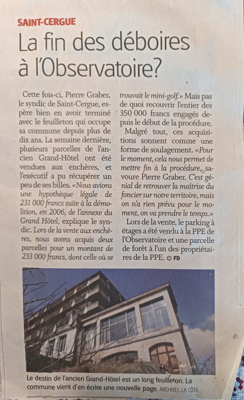 Finalement, la fondation a été déclarée en faillite, et ses biens ont été vendus aux enchères à Nyon en 2017. La commune a acquis plusieurs terrains, l’Observatoire a racheté des lots dans sa propre parcelle, mais le Lot 41, évalué à environ 750 000 CHF, n’a trouvé aucun acquéreur (voire article ici).